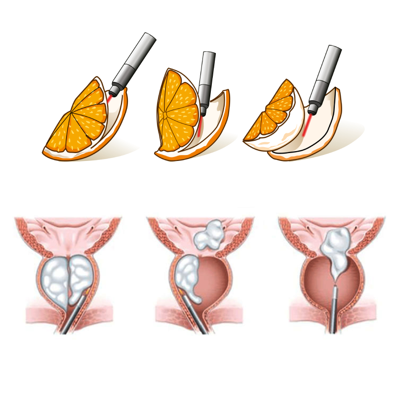 Cơ chế: HoLEP sử dụng năng lượng laser Holmium để bóc toàn bộ nhân tuyến tiền liệt tăng sản ra khỏi vỏ bao, tương tự như cách bóc cam. Sau đó, nhân này được đẩy vào bàng quang và xay nhỏ để hút ra ngoài.