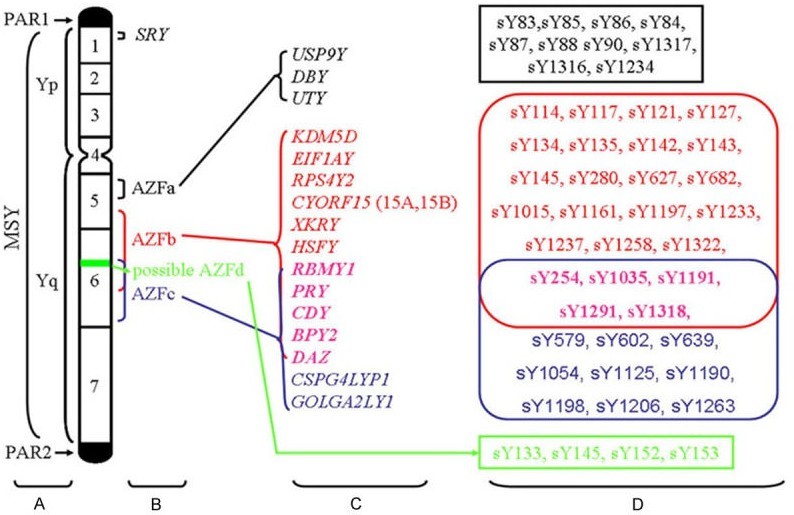 Các trình tự AND sử dụng cho chẩn đoán mất đoạn AZF abc bao gồm: SRY, ZFY (là các trình tự chứng cho người nam và người nữ), sY84, sY86 (AZFa), sY127, sY134 (AZFb), sY254, sY255 (AZFc). Người nam không bị mất đoạn sẽ xuất hiện đồng thời tất cả các trình tự được phân tích. Người nam bị mất đoạn nhỏ sẽ không xuất hiện các trình tự bị mất.