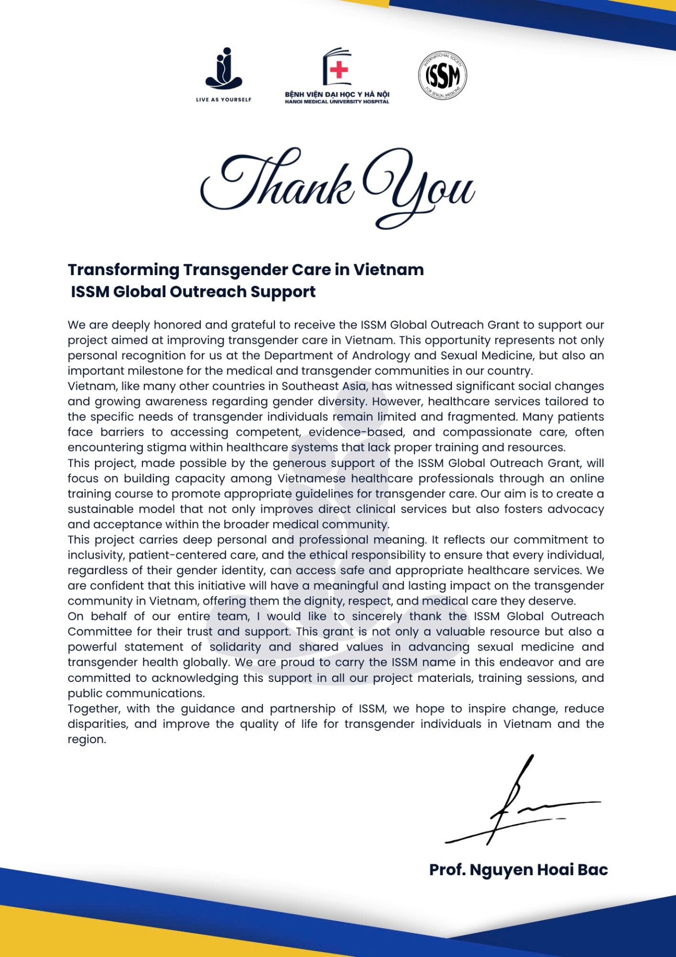 Thay mặt nhóm thực hiện dự án, tôi xin gửi lời cảm ơn chân thành tới Hội đồng Chương trình ISSM Global Outreach vì đã tin tưởng và đồng hành cùng chúng tôi. Khoản tài trợ này không chỉ là nguồn lực thiết thực mà còn là lời khẳng định đầy ý nghĩa về sự sẻ chia và những giá trị nhân văn mà ISSM và chúng tôi cùng theo đuổi trong việc phát triển lĩnh vực Y học Giới tính và chăm sóc sức khỏe cho người chuyển giới trên toàn cầu.
