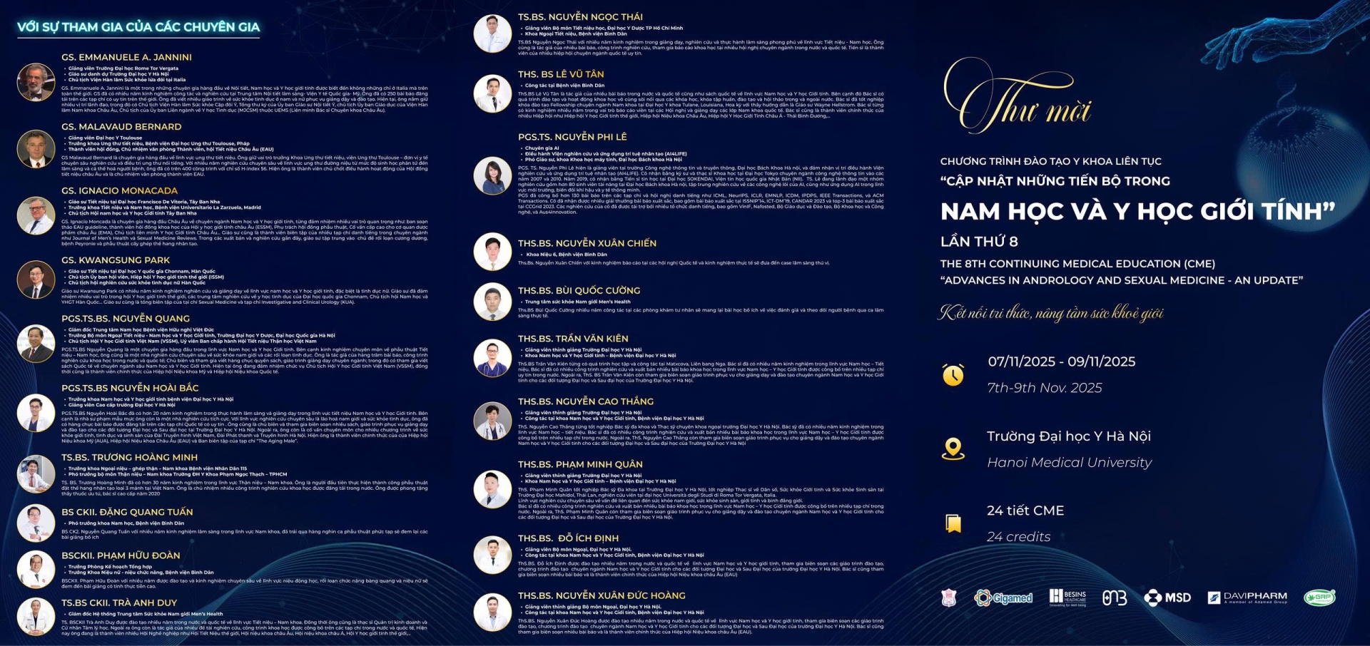 Chương trình năm nay quy tụ nhiều giáo sư, chuyên gia đầu ngành trong lĩnh vực Nam học và Y học giới tính đến từ Việt Nam và Quốc tế, mang đến những cập nhật mới nhất về chẩn đoán, điều trị và các tiến bộ khoa học liên quan.