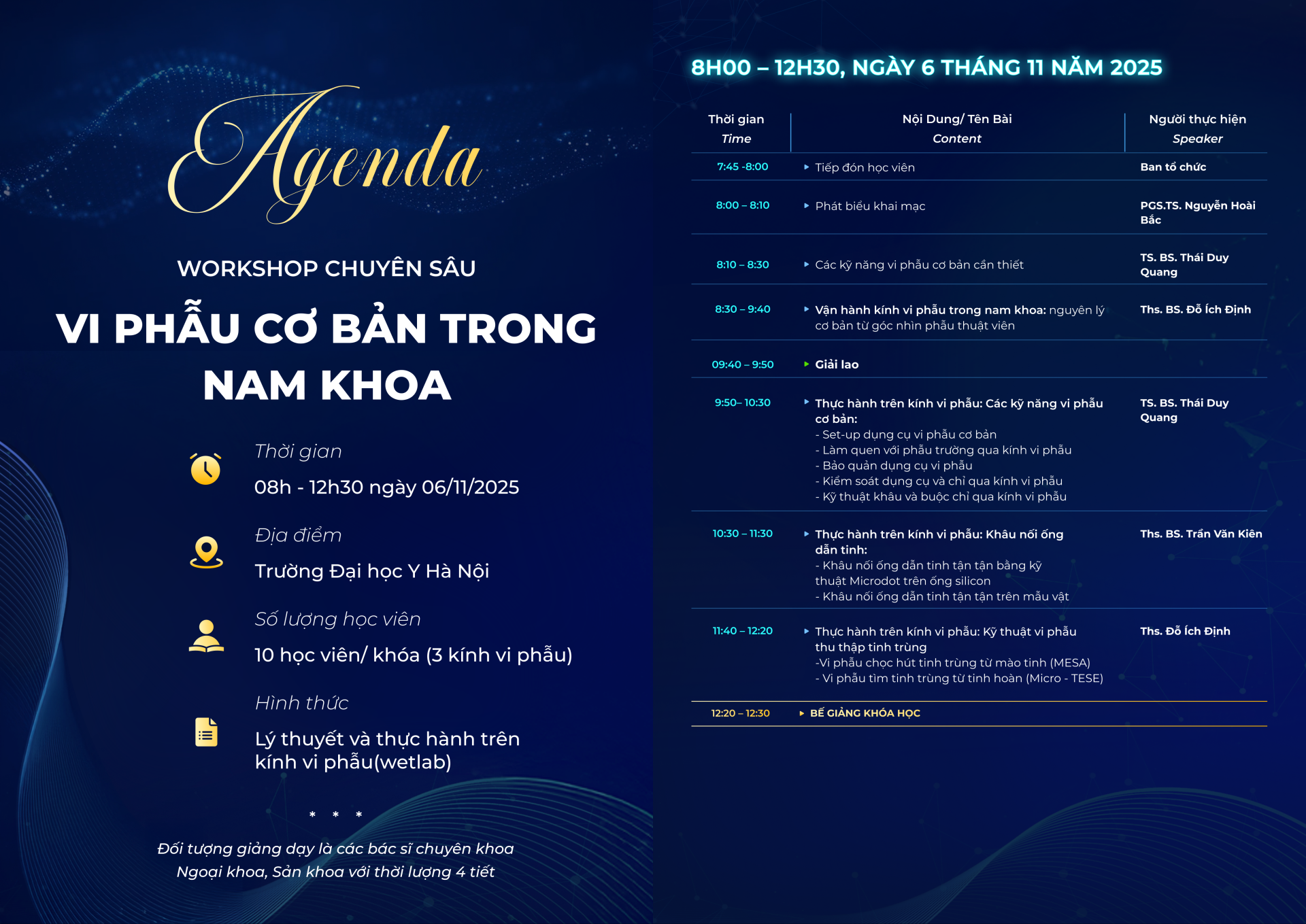 Với thời lượng 4 tiết, workshop “Vi phẫu cơ bản trong Nam khoa” không chỉ mang đến kiến thức cập nhật mà còn giúp học viên rèn luyện kỹ năng vi phẫu tinh tế và chuẩn xác, góp phần nâng cao chất lượng điều trị vô sinh – hiếm muộn nam và các bệnh lý liên quan.