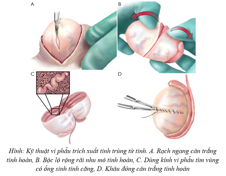 – Rạch da đường giữa bìu, qua các lớp cân cơ, bộc lộ tinh hoàn. Dưới quan sát của kính vi phẫu độ phóng đại 6x, rạch một đường ngang 2-3 cm tại cực giữa tinh hoàn. Qua cân trắng tinh hoàn, bộc lộ rộng rãi nhu mô tinh hoàn. Dưới kính vi phẫu với độ phóng đại 16 – 25x quan sát tìm các đảo nhỏ ống sinh tinh (vùng có các ống sinh tinh giãn căng to, có thể chứa nhiều tinh trùng). Trong trường hợp toàn bộ nhu mô tinh hoàn đã thoái hóa, phẫu thuật viên sẽ sinh thiết nhiều điểm trên tinh hoàn để phân tích mô bệnh học. Nếu vẫn không tìm thấy tinh trùng thì sẽ thăm dò tinh hoàn bên đối diện. Diện cắt sau đó được cầm máu và cân trắng tinh hoàn được khâu bằng chỉ không tiêu 5-0 hoặc 6-0.