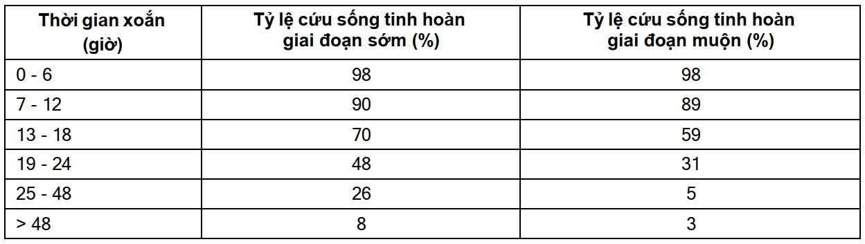 Nếu bạn hoặc người thân bị đau bìu cấp tính, đừng chần chừ! Hãy đến ngay cơ sở y tế chuyên khoa. Bảng dưới dây cung cấp tỉ lệ bảo tồn theo thời gian