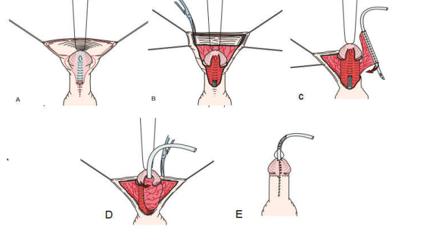 - Tạo ống niệu đạo mới: dùng vạt da niêm mạc bao quy đầu hình đảo theo chiều ngang có cuống mạch ở lưng DV. Kỹ thuật khâu cuộn ống niệu đạo.
